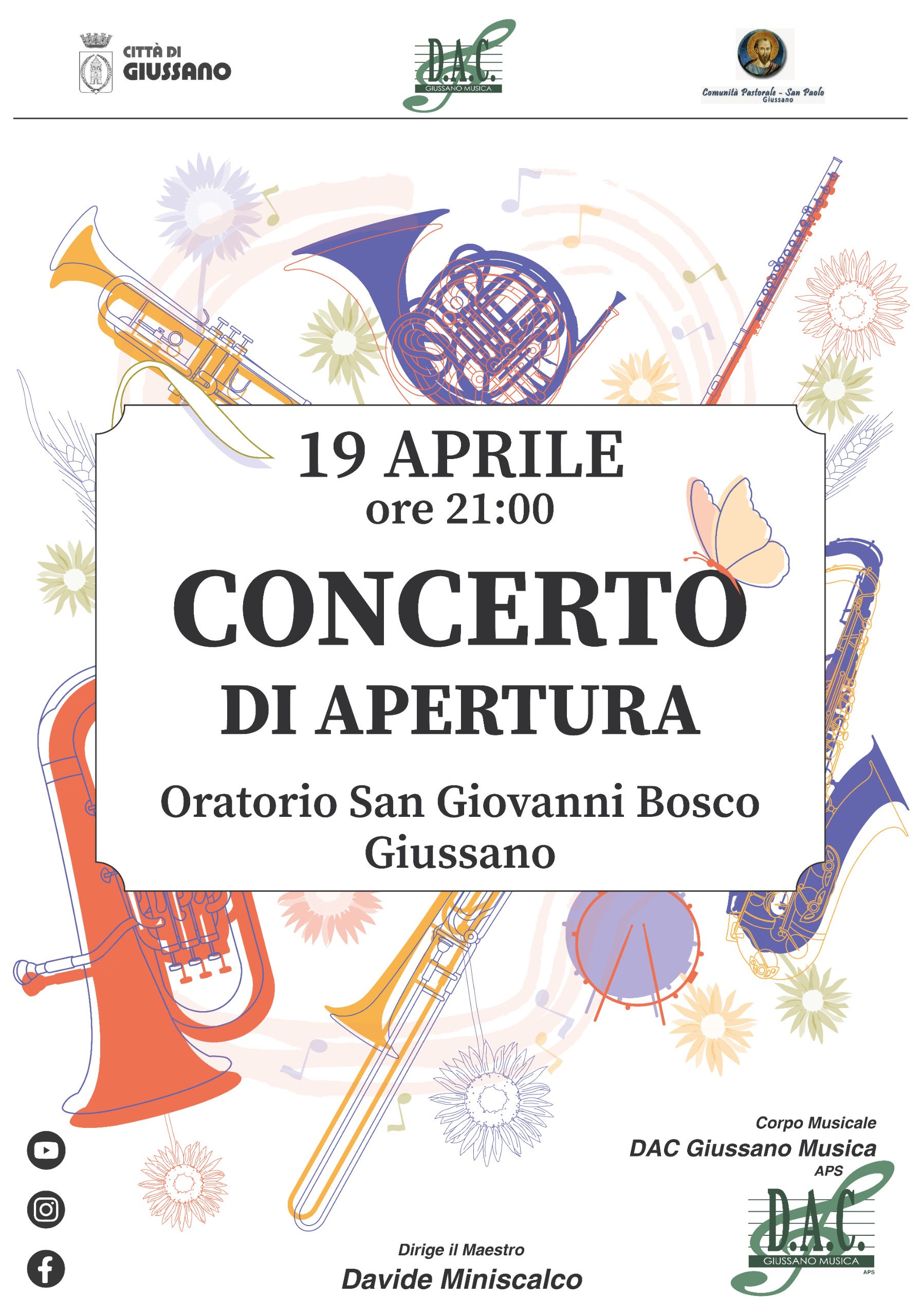 Appuntamento per il consueto “CONCERTO DI APERTURA” presso l’Oratorio San Giovanni Bosco di Giussano. DOMENICA 19 APRILE 2026, alle ore 21:00 in Sala Don Caccia, la D.A.C. aprirà la nuova stagione con un concerto di brani classici e intramontabili. Dirige il Maestro Davide Miniscalco. Ingresso libero.