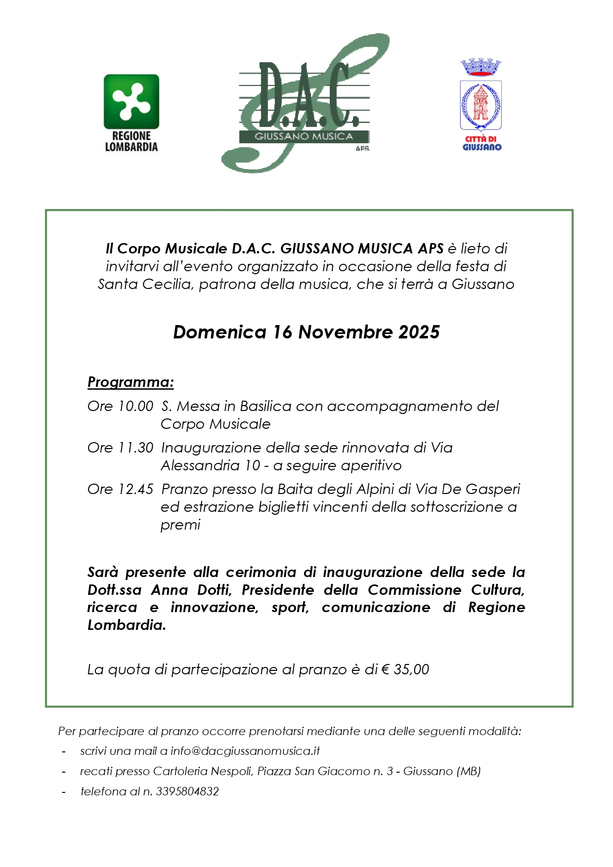 Domenica 16 novembre 2025 il Corpo Musicale D.A.C. Giussano Musica festeggia Santa Cecilia, patrona della musica, con la Santa Messa in Basilica e l’inaugurazione della sede rinnovata di via Alessandria 10, presso la scuola primaria. Seguirà il pranzo alla Baita degli Alpini con l’estrazione dei biglietti vincenti della sottoscrizione a premi.